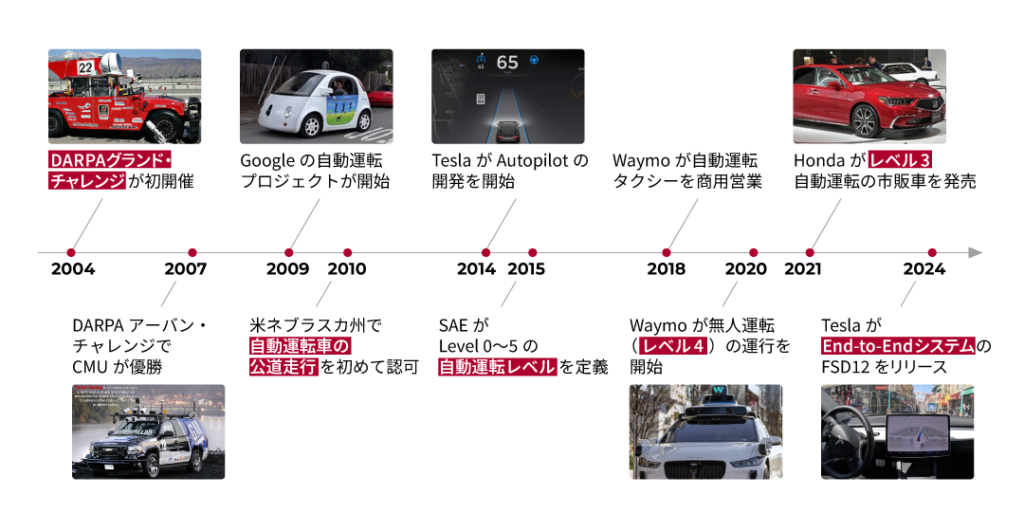 自動運転市場の動向・歴史 AI開発の概要および次期GPU計算基盤・自動運転開発の歴史(2004〜) 1. 自動運転構想から実装競争への移行 世界で最初に「自動運転」の構想が世に出たのは1939年と言われています。1939年~1940年にかけて開催されたニューヨーク万国博覧会において、米GMが「Highways and Horizons」というパビリオンを出展し、20年後の未来都市像を表現したジオラマを展示しました。このジオラマ内の都市を走る高速道路は「Automated Highway Systems」と名付けられ、「未来社会では自動車の運転は自動化される」という強烈なメッセージを残しました。 その後、各国の研究機関を中心に自動運転の研究・開発が進められましたが、本格的な進展は2000年代後半のDARPAグランド・チャレンジが大きなきっかけとなりました。アメリカで行われたこのコンペでは実際の車を使い、大学・研究機関を中心として自動運転車の設計・開発が進められました。政府・各企業からも多額の投資が行われ、このコンペに出場した研究者・エンジニアがGoogle Waymoをはじめとする自動運転企業を創設しました。2010年代後半には地域・ユーザーを限定した形の自動運転商用サービスも開始されています。 2. 自動運転レベルという枠組みの本質 自動運転は一般にレベル1からレベル5までの段階で整理されますが、これは単純な技術進化の順序を示すものではありません。各レベルは、運転に対する責任の所在や、システムが機能する条件を整理するための枠組みです。レベル2までは運転支援の範囲にとどまり、最終的な責任は人間にあります。一方で、レベル3以上ではシステム側が判断と責任を担う場面が生じます。 重要なのは、これらのレベルが連続的に積み上がるとは限らない点です。特定条件下で成立する自動運転を広げていけば、自然に完全自動運転に到達するわけではありません。むしろ、限定条件を前提とする設計は、一般化を阻む要因になる場合もあります。完全自動運転を目指すためには、最初からロングテールな事象を含む現実環境への対応を視野に入れた技術選択が求められます。 3. ルールベース自動運転の限界とロングテール問題 一般公道での運転が難しい理由は、発生頻度が低く、判断難度が高い状況が無数に存在する点にあります。工事現場、交通誘導、予測不能な歩行者の動きなど、運転中には常に例外的な判断が求められます。人間は、周囲の情報を整理し、社会的な常識や文脈を踏まえて行動を選択しています。 従来の自動運転開発では、認知・予測・計画・制御を分業化し、それぞれに詳細なルールを設けるアプローチが主流でした。しかしこの方法では、例外的な状況が増えるほどルールが肥大化し、システム全体の複雑性が増していきます。結果として、開発や検証の負荷が高まり、一般化が難しくなるという課題が顕在化しています。 4. End-to-Endと生成AIによる前提条件の変化 こうした課題に対する一つの方向性として、センサ入力から運転行動までを一貫して学習するEnd-to-End型の自動運転が注目されるようになりました。この方式では、人手でルールを設計するのではなく、データと学習によって判断能力を獲得することを目指します。大量の走行データと計算資源を前提とする一方で、ロングテールな状況に対する一般化性能を高められます。 さらに近年、生成AIの発展により、「複雑な情報を整理する」「文脈や常識を踏まえて判断する」といった能力が学習によって獲得できることが示されました。これは運転に必要な能力と親和性が高く、自動運転開発の前提条件を大きく変える要素となっています。自動運転研究の主戦場も、車両工学中心から、AI・機械学習を軸とした領域へと移行しつつあります。 5. 文脈理解と未来予測を支える技術群 完全自動運転を成立させるためには、現在の状況を正確に把握するだけでなく、「何が重要で、何が重要でないか」を整理し、その先に起こり得る変化を予測する必要があります。このため、視覚と言語を統合して状況を理解する技術や、視覚・言語・行動を一体で扱う学習手法が活用されるようになっています。これらの技術は、単なる物体検出を超えて、運転に必要な文脈理解を支えます。 また、未来の状態を内部でシミュレーションする世界モデルや、三次元空間を高精度に表現する3Dガウシアンスプラッティング技術も重要な役割を果たします。これにより、現実では遭遇頻度が低いが重要度の高い状況についても、学習や検証の対象に含めることが可能になります。文脈理解と未来予測、空間理解を組み合わせることで、運転判断の安全性と汎用性を高める方向性が明確になっています。 6. データ・計算資源・回転数を軸とする競争構造 生成AI時代の自動運転市場では、単一のアルゴリズムやモデルの巧妙さだけで競争力が決まるわけではありません。重要なのは、十分な量と質のデータを継続的に収集できるか、それを処理・学習する計算資源を確保できる
