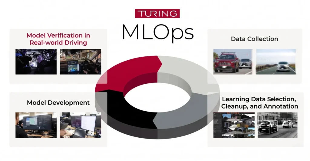 Turing’s MLOps is structured as a continuous workflow spanning six phases: Data Store, Curation, Data Processing, Training, Deployment, and Experiment Management. What makes this distinctive is that vehicles appear at both ends of the workflow—data collection and real-world validation are built into the cycle, not added on top of it.