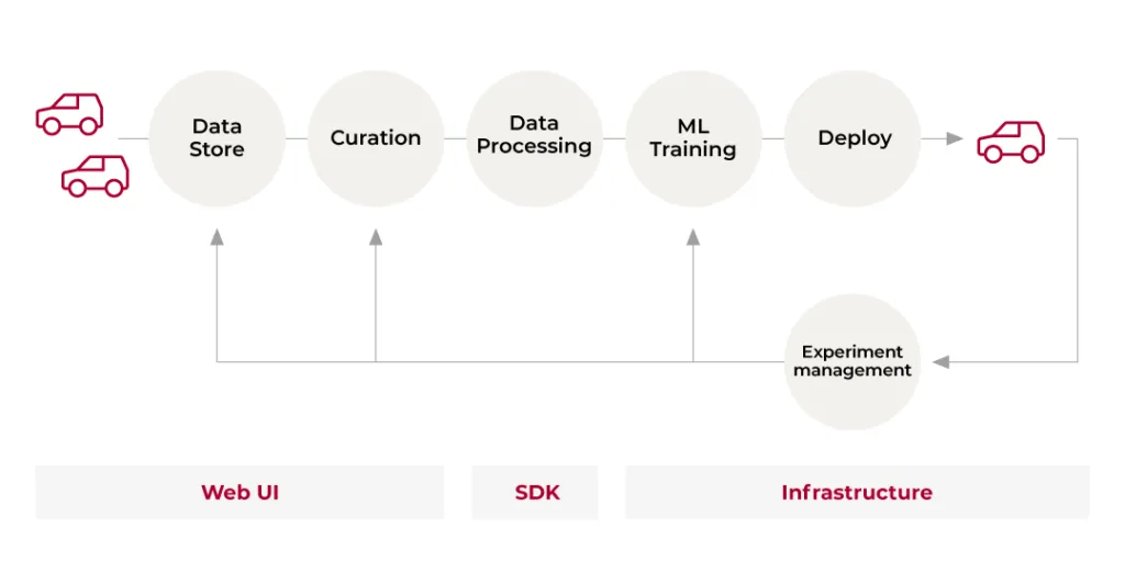 Experiment management extends beyond training logs. Results from real-world vehicle runs are integrated and evaluated. Cases that didn’t work are fed back into the front of the cycle as “data we need to collect next.” This feedback loop is the core of continuous improvement.