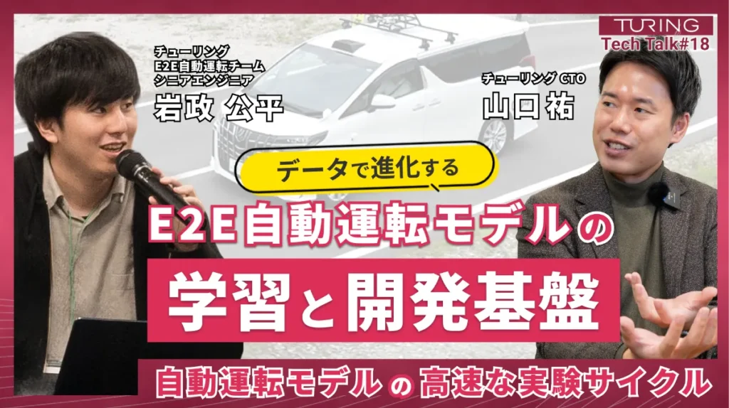 岩政 公平 End-to-Endモデル開発 2023年新卒入社 これまでのキャリア 大学・大学院時代は生物学を専攻しつつ、Kaggle などのデータ分析コンペティションに積極的に参加するようになり、画像解析、自然言語処理、テーブルデータ分析など様々なドメインの機械学習タスクを解いていました。研究では画像解析とネットワーク分析を活用した植物の葉脈の定量化を行い、アルバイトやインターンでも画像を対象にした物体認識モデルや、需要予測のための機械学習モデルを作成していました。 修士 1 年のときにサマーインターン 1 ヶ月参加して、翌年修士 2 年と並行する形で正社員として入社しました。 入社のきっかけ 創業メンバーの機械学習エンジニアの方と一緒に働いてみたいという理由で、自動運転をつくることは二の次でインターンの応募を決めました。 ただインターンで働いていた中で、自動運転に関わる AI 技術が面白く、データ中心の自動運転 AI は今後のトレンドになると確信しました。当時、このアプローチを掲げた日本の会社はあまりなかったため、スタートアップとして技術的にもビジネス上でも一緒に成長させていきたいという思いで入社を決めました。 仕事内容 データパイプラインの構築 E2Eモデル学習用のデータセットの作成 機械学習フレームワークの作成 モデルデプロイや評価基盤のプロトタイプの作成 仕事の醍醐味・やりがい 自動運転システムの開発が困難であること、達成したときのインパクトが大きいことです。そもそも機械学習というタスクは、十分なデータが足りていない、データの品質が悪い、モデリングに課題がある、など様々な条件によって求める水準に性能が達しないことがあります。自動運転の開発は機械学習だけで解決する課題ではなく、様々な技術を掛け合わせることで達成する困難なタスクです。ただ、達成できれば自動運転は社会的に大きなインパクトを与えます。これはビジネス上でも社会的にも大きな価値を生み出すことができ、これがやりがいだと考えます。 チューリングの職場環境について 原則出社なので、コミュニケーションが素早く取れます。 開発環境の改善を常に行なっています。Coding Agentを積極的に導入し、モニターや照明等の手元の作業環境の改善も素早く行なってもらえます。 計算資源に大きく投資しています。 チューリングにマッチする人 深く課題に取り組むことができる人。 能動的に、かつ人を巻き込んで行動できる人。 変化を受け入れることができる人。 チューリングを検討している方へ インターンや新卒入社を志望している方であれば、ひとまずオフィス見学や気軽にカジュアル面談に応募してもらえると、会社の雰囲気やその時の技術力や課題が見えるのでいいのかなと思います。車や自動運転に興味がなくても、チューリングで取り組む課題の面白さがあると思うので、カジュアルに話せればです! 技術的な能力はもちろん、能動的に、様々な人を巻き込む開発・行動を行なってきた方と一緒に働きたいです。 私の愛車紹介 MAZDA3 FASTBACK 自動運転を目指す上で人間も運転できないといけないなと思い、車の購入を決めました。MAZDA3 を選んだのは外見がカッコよく、内装もシンプルで高級感があるのがお気に入りポイントです。 他に乗ってみたい車、その理由 次は ADAS が強い車に乗ってみたいです。