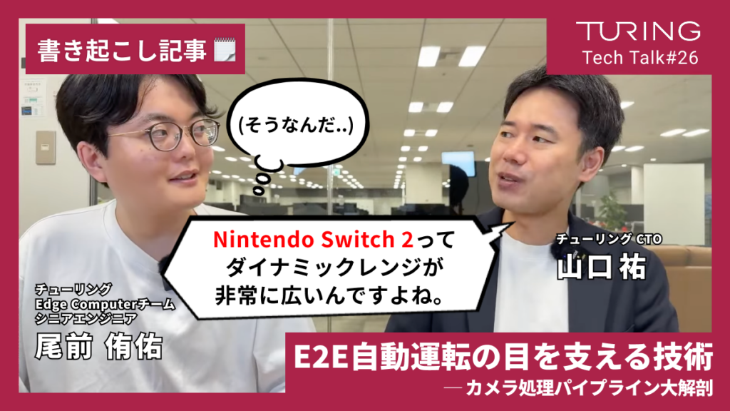 尾前 侑佑 自動運転システム開発 2025年入社 これまでのキャリア 新卒でソニーセミコンダクターソリューションズに入社してソフトウェアエンジニアとして働き始め、車載向けイメージセンサーの仕様策定やFW開発、評価、ツール開発をしていました。その後、ソニーコンピュータサイエンス研究所に異動して人工衛星に取り付ける光通信端末のソフトウェア開発や実際の運用をしていました。どちらの部署でも自分が作ったものが実際に物理世界で動いているのを目にできるところに一番のやりがいを感じていました。 入社のきっかけ AI性能が自分の想像以上のスピードで進化しているのを目にしてよりAIに近い企業で働きたいと思いました。もともと、新卒時に自動車メーカーや自動車部品メーカーも受けており、自動車業界に興味があったこと、SNSでチューリングの存在を前から知っていたことからチューリングへの応募を決めました。 仕事内容 自社設計基板のRTOS開発データ収集・自動運転システムの開発、メンテナンス。関わる範囲は、センサや車体のレイヤーからMLの領域まで幅広いです。 仕事の醍醐味・やりがい とにかく関わることができる領域が広いです。社内の情報はオープンになっているので自分で動けば色々なレイヤーに触れられます。 センサデータを理解してクリーンな状態でモデル学習まで繋げることに面白さを感じます。自分が開発しているシステム上でモデルがうまく運転したときに一番のやりがいを感じます。 チューリングの職場環境について 社内制度は要望に応じて素早く改定されより働きやすい環境になっています 社員はみな主体的に課題に取り組んでいます 原則出社で、社内のコミュニケーションを促す制度(おやつ会、オールハンズなど)があるので社内の色々な人と喋ることができ、そこから新しいアイデアが生まれたりします チューリングにマッチする人 自分から主体的に仕事を見つけて取り組める人 一つのものをとことん突き詰められる人 様々な変化に適応して楽しめる人 チューリングを検討している方へ 自動運転というグランドチャレンジには試行錯誤の積み重ねが必要になります。その分だけ状況は激しく変化していきますがそういった変化を楽しみつつゴールの達成に貢献できる部分を探して動き出せる方と一緒に働きたいです。また、自動運転は車体からモデルまで多くのレイヤーが統合されて実現されます。自分の技術領域を限定せずに別の領域も積極的にキャッチアップできる人ほど楽しく仕事をできるのではないかと思います。