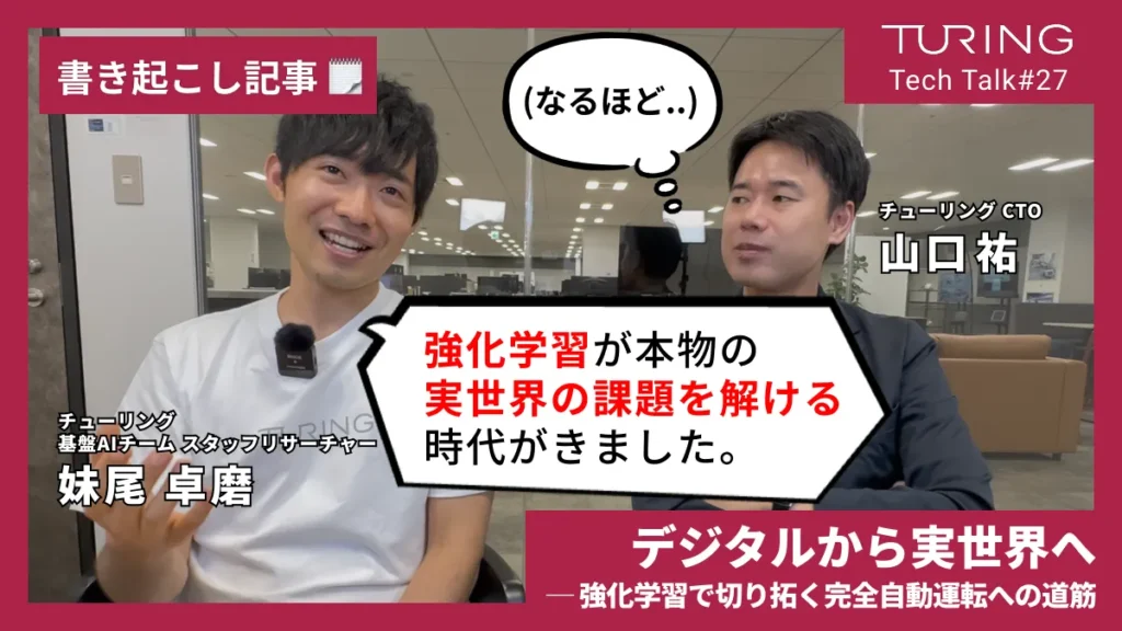 妹尾 卓磨 End-to-Endモデル開発 2025年入社 これまでのキャリア 前職は新卒でソニーAIに入社してGran Turismo Sophyというプロジェクトに携わっていました。このプロジェクトではPlayStation向けレースゲームであるGran Turismoにおいて、世界トップのプレイヤーに勝利する強化学習エージェントの研究開発を行っていました。研究成果を科学誌Natureで発表したり、実際のゲームにデプロイして家庭用ゲームとしては初となる深層強化学習エージェントの製品化を実現しました。 ソニーAIと並行して、社会人博士として慶應で博士号を取得しました。博士課程ではセミパラメトリックな深層強化学習アルゴリズムの研究や、未踏IT人材発掘・育成事業に採択されたオフライン強化学習ライブラリd3rlpyの開発を行っていました。 入社のきっかけ 前職ではデジタル世界における強化学習の限界を突き詰めたと思っています。そして、デジタル世界で完結している成果に自分も含めて人々はもう驚かないと感じていました。次は強化学習で現実世界に挑戦したいと社内外で機会を探していたところでチューリングと出会いました。もともとレースゲームを題材に取り組んでいたこともあり、強化学習技術で現実世界の車両を制御することに夢を抱いていたので、自動運転より面白い挑戦はないという確信をもって入社しました。 仕事内容 RLチームのチームリード 3DGSを使用したクローズドループシミュレータの開発 分散強化学習基盤の開発 強化学習エージェントの学習 強化学習エージェントの公道走行実験 仕事の醍醐味・やりがい 日本で誰もやったことのないことに挑戦できる 海外の強力なプレイヤーに真っ向勝負を挑める 未知の課題に試行錯誤しながら取り組むことができる 強化学習技術で現実世界の車両を公道で走らせることができる チューリングの職場環境について 優秀な仲間と一緒に技術的なチャレンジに挑めることは、エンジニア・リサーチャーとして純粋に楽しい環境です。 チューリングの確保している人数当たりの計算リソースは非常に大きいので、大規模な学習をたくさん回せるのは貴重な体験です。 解き方が自明でない課題がたくさんあるため、会社としてとにかくチャレンジしてみるという精神があるのはとてもいいです。 チューリングにマッチする人 未知の課題に楽しんで挑戦できる人 最先端の技術を追いかけたい人 現実世界でハードウェアを動かすことにロマンを感じる人 チューリングを検討している方へ E2E自動運転は非常に面白い技術的なチャレンジであるだけでなく,大きな社会的なインパクトもあるドメインです。技術者としての高みを目指すと,それがそのまま社会に大きく貢献できるテーマは多くないと思います。これからも解き方が自明でない課題にたくさん直面すると思いますが,一緒に楽しんで乗り越えられる方にとってはこれ以上ない場所です。ぜひ気軽に遊びに来てください。開発車両を実際に見ればどれほど面白いことをやっているか体感できます。 私の愛車紹介 アコード e:HEV ホンダ社員の知り合いにホンダミュージアムを案内されてホンダというブランドに魅了されて買いました。チューリングに入社するまでペーパードライバーだったのでアコードの豊富な先進機能に助けられています。 他に乗ってみたい車、その理由 ホンダの新型プレリュードもすごくかっこいいので乗ってみたいです。