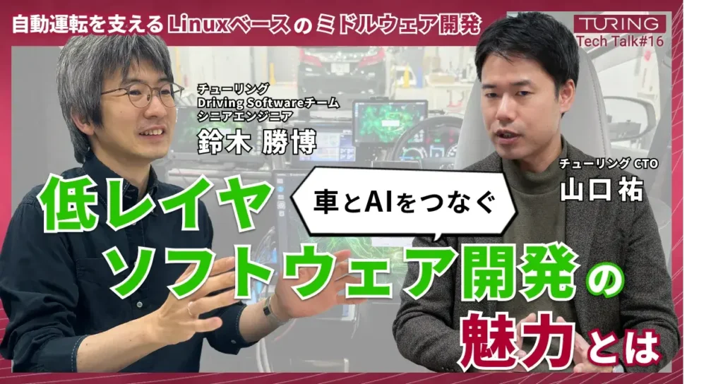ソフトウェアエンジニア(自動運転システム) 役割 MLモデル以外の自動運転システム開発を行うソフトウェアエンジニアの主な役割は、完全自動運転や自動運転を世の中のインフラにできるよう、システムの安全性と安定性を担保することにあります。 MLエンジニアなどが開発する先進的なモデルが、公道という現実世界で安全かつ安定したシステムとして広く使われるために、基盤となるアプリケーションやシステム全体のアーキテクチャの構築・維持に責任を持ちます。Linux環境下で動作するシステムの開発を通じて、自動運転という未来の技術の信頼性を根底から支える、非常に重要なミッションを担います。 業務内容 車載計算機上で動くLinuxのアプリケーションの開発 Webアプリケーションの開発 データ収集システムの開発・運用 インフォテイメント機能の設計・開発 OTA更新基盤の設計・開発 フリート管理プラットフォームの設計・開発 パフォーマンスチューニングおよび品質向上施策の実施 ※1:OTA(Over-the-Air):ソフトウェアを無線通信でアップデートする技術のこと ソフトウェアエンジニア(自動運転システム)として働くメリット チューリングの自動運転システムのソフトウェアエンジニアとして働く最大のメリットは、完全自動運転や自動運転を社会のインフラにするという、極めて大きな目標に貢献できることです。MLエンジニアが開発する先進的なモデルが、世の中に広く安全かつ安定して使われるシステムになるために、安全性と安定性を担保するシステムの構築に深く関われます。 どれほど先進的なモデルが開発されても、それを支えるシステムが安全でなければ意味がありません。このチームは、そのシステムの安全と安定を保証するという、社会貢献性の高い、基盤となる役割を担います。 10年後、15年後に自動運転が世の中のインフラとなったとき、自身が携わったシステムの開発がその大きな功績となったことを実感できるでしょう。Linux環境でのアプリケーション開発経験を活かし、次世代の社会インフラを築くという、キャリアにおいて非常に価値のある経験を積むことができます。 この職種にマッチする人材 Linux環境でのアプリケーション開発経験が豊富な人材です。チューリングの自動運転システムは、NVIDIA製の計算機Orin上で、Ubuntuと呼ばれるOSで動作しています。そのため、Linux環境で動くシステムの開発経験は必須要件となります。特に、高い安定性と安全性が求められる環境でのアプリケーション開発経験を持つ方は、非常にマッチします。 Linux環境でのアプリケーション開発経験が豊富な人 組み込みソフトウェア開発の経験を持つ人 自動運転システムやロボットなどリアルタイム性が求められる開発経験がある人 システム全体の安全性と安定性の担保に責任を持って取り組める人 複数のコンポーネントやモジュールから成る複雑なシステム開発経験がある人 疎結合なシステムにおけるPUB/SUB通信などの連携設計経験がある人 他職種連携の魅力とやりがい ソフトウェアエンジニア(MLOps) 現実世界のデバイスからのデータ収集、およびデータの書き出し形式や仕組みについて連携します。MLOpsが構築するデータパイプラインの起点となる部分に関わるため、データが学習可能な形式で適切に、かつエラーなく書き出されるように、共同でシステムの実装や改善を行います。データの形式変更やエラー対応など、パイプラインの「川上」における要件調整が主な業務です。 現実世界のデータをいかにモデル学習に利用できるかという、自動運転開発の本質的な課題に向き合えます。デバイスからのデータ取得・書き出しという、MLパイプラインの最も上流に位置する部分に関わることで、データの品質と効率に貢献するという、技術的な重要性の高い役割を担えます。 MLエンジニア モデルが出力する信号の受け渡しや、システム上でのモデルのパフォーマンス最適化について連携します。モデルが自動運転システム上でスムーズに動作し、他のシステムやモジュールに高速に信号が渡されるような工夫を、システム側から行うことが求められます。 先進的なMLモデルの成果を、安全で安定した「プロダクト」として社会に提供するための橋渡し役を担います。モデルの性能を最大限に引き出しつつ、システムとしての堅牢性を確保するための技術的な工夫は、難易度が高くやりがいが大きいと言えます。 ソフトウェアエンジニア(自動運転システム)のメンバー 自動運転システム開発 2022年入社 渡邉 礁太郎 自動運転システム開発 2025年入社 尾前 侑佑 自動運転システム開発 2022年新卒入社入社 徳弘 賢人 チューリポ・テックブログの関連記事 Turing Tech Talk 第16回 「自動運転を支えるLinuxベースのミドルウェア開発」 Turing Tech Talk 第14回 「TypeScriptでつくる自動運転UI」 車載ソフトウェア開発の挑戦!自動運転を支えるデータ処理と開発の舞台裏 「要求仕様が与えられない。そこに自動運転開発の面白さがある